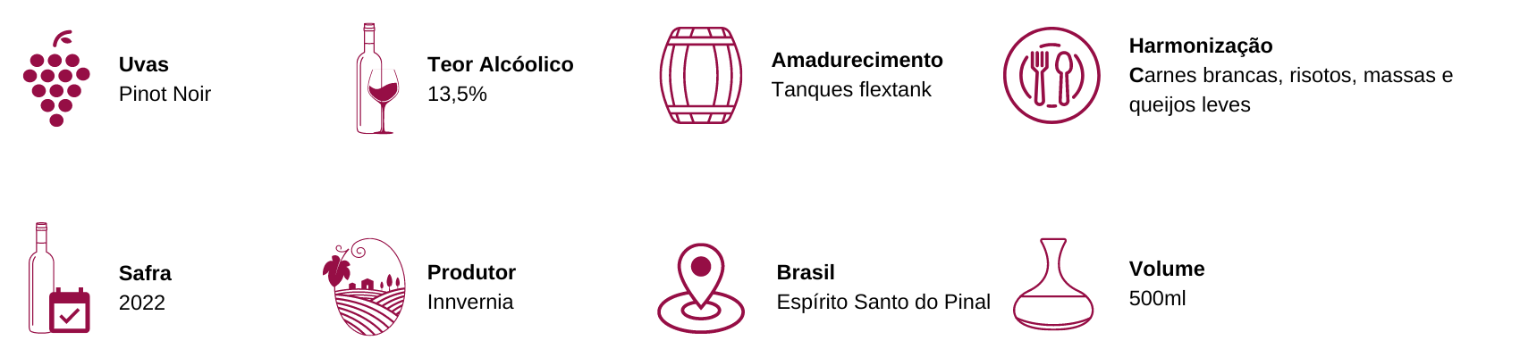 A proposta da vinícola InnVernia é reter o máximo de personalidade e qualidade da fruta, revelados no vinho final. Elaborar exemplares com vida, exuberância e explosão de sabores, com uma textura única. Por esta razão, o Pinot Noir Carbon Pure é sobre a pureza da fruta, o equilíbrio e o perfume. A ideia de produção desse rótulo de classe, tem como propósito representar o vinho brasileiro, com elegância e sofisticação.