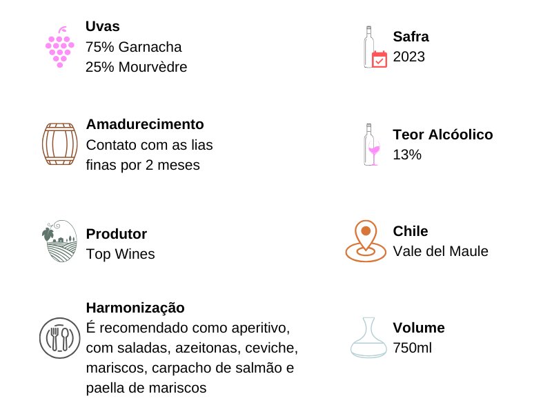 Elaborado com um corte especial de 75% Garnacha e 25% Mourvèdre, este rosé entrega toda a vivacidade do terroir de Cauquenes, no Vale do Maule. Com coloração rosado intenso, exibe aromas delicados de morango fresco, notas florais e um leve toque mineral.