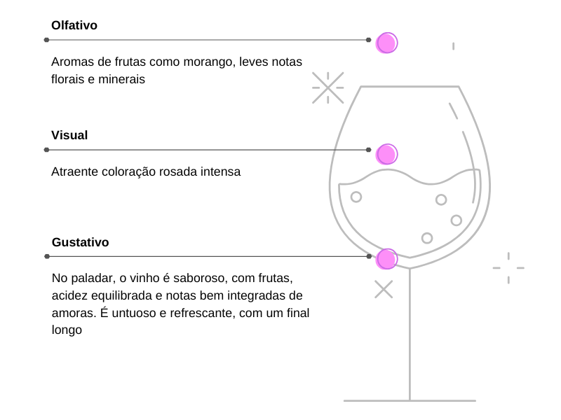 No paladar, é saboroso e envolvente, com acidez equilibrada, notas frutadas de amora e um final longo e refrescante. A passagem por lias finas por 2 meses confere uma textura untuosa e agradável.