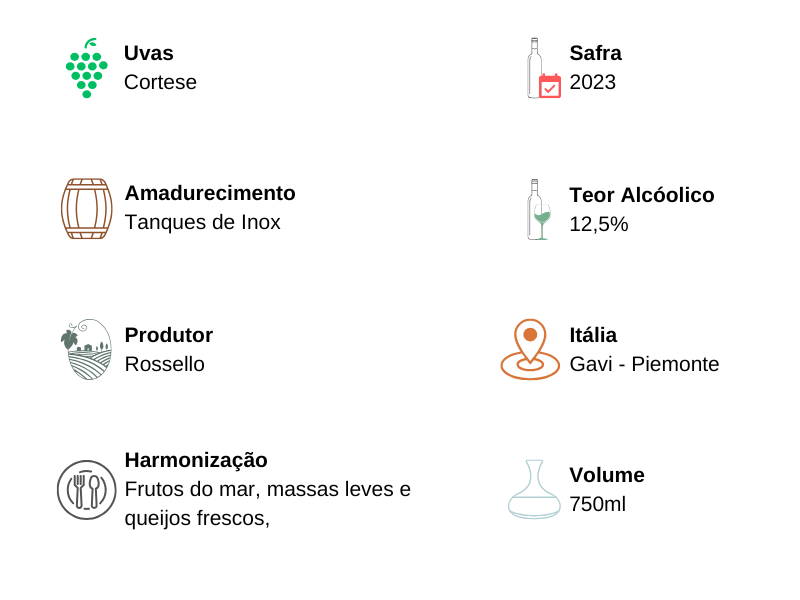 O Rossello Vini Gavi Del Comune Di Gavi 750 ml é um vinho branco italiano refinado que captura a elegância fresca da uva Cortese da prestigiada região de Gavi, no Piemonte.
