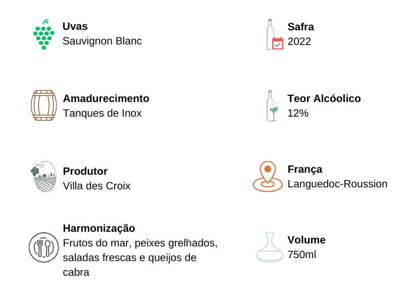 Sauvignon Blanc francês fresco e aromático, com notas cítricas, herbáceas e final mineral. O Villa des Croix Sauvignon Blanc é elaborado na França e traduz toda a elegância e frescor desta variedade emblemática